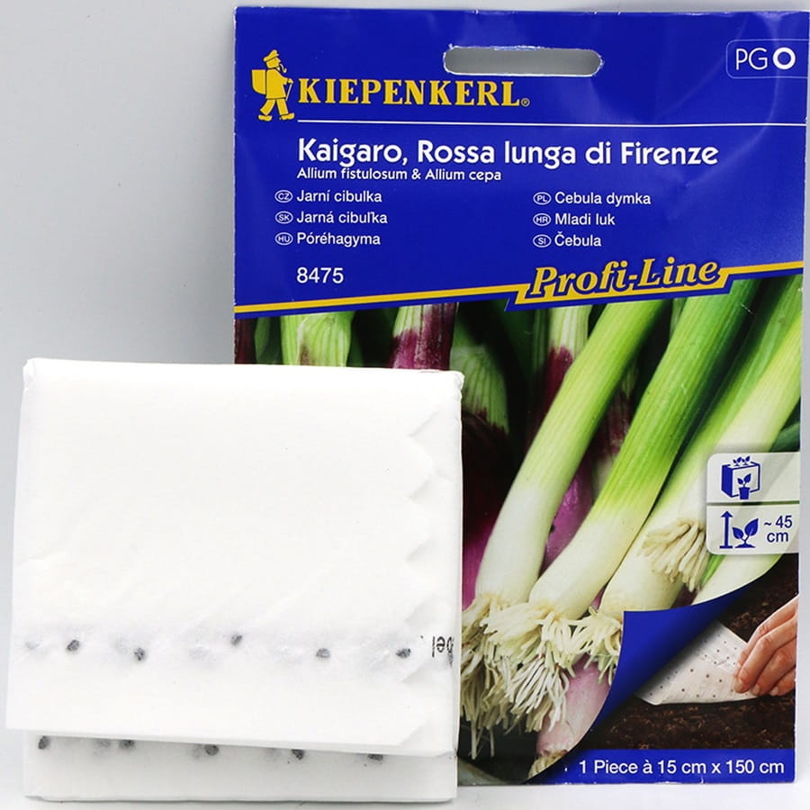 Dwie cebule dymki. Jedna z długą, białą łodygą i jedna łagodna, czerwona odmiana. Łatwy siew dzięki nasionom na taśmie.