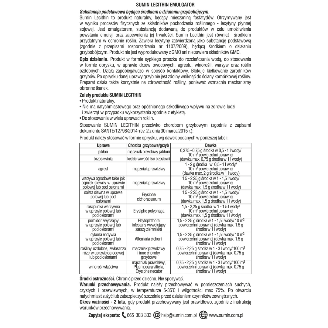 Sumin Lecithin jest preparatem grzybobójczym, który chroni i zapobiega przed szkodnikami tj. mączniak prawdziwy jabłoni, kędzierzawość liści brzoskwini, mączniak prawdziwy, erysiphe cichoracearum, erysiphe polyphaga, phytophthora infestans wywołujący zarazę ziemniaka, altemaria cichorii, plasmopara viticila, erysiphe necator. Preparat jest ekologicznym i bezpiecznym rozwiązaniem w walce z szkodnikami oraz wzmacnia rośliny poprawiając ich wygląd oraz plon. Można go stosować przez cały rok.
