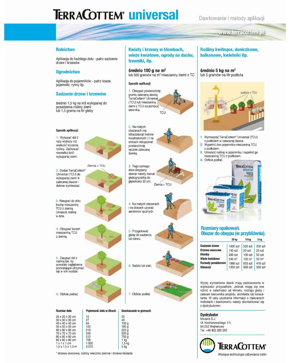 Doskonale nadaje się również do stosowania w doniczkach i skrzynkach balkonowych, pojemnikach i koszach wiszących. TerraCottem znajduje zastosowanie także w rolnictwie.