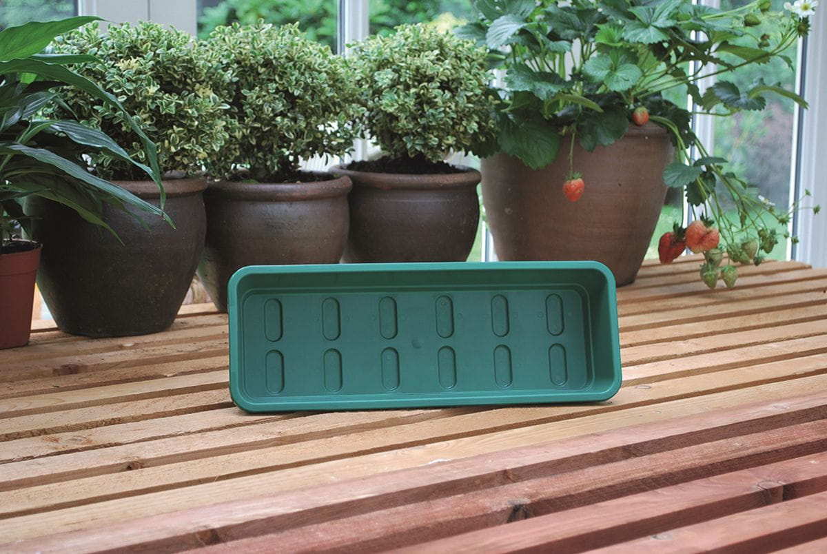 Taca ogrodnicza marki Garland w rozmiarze 37 cm x 13,5 cm x 6 cm. Ten model nie posiada na spodzie otworów drenujących – tacka świetnie posłuży jako podstawka pod wielodoniczki.