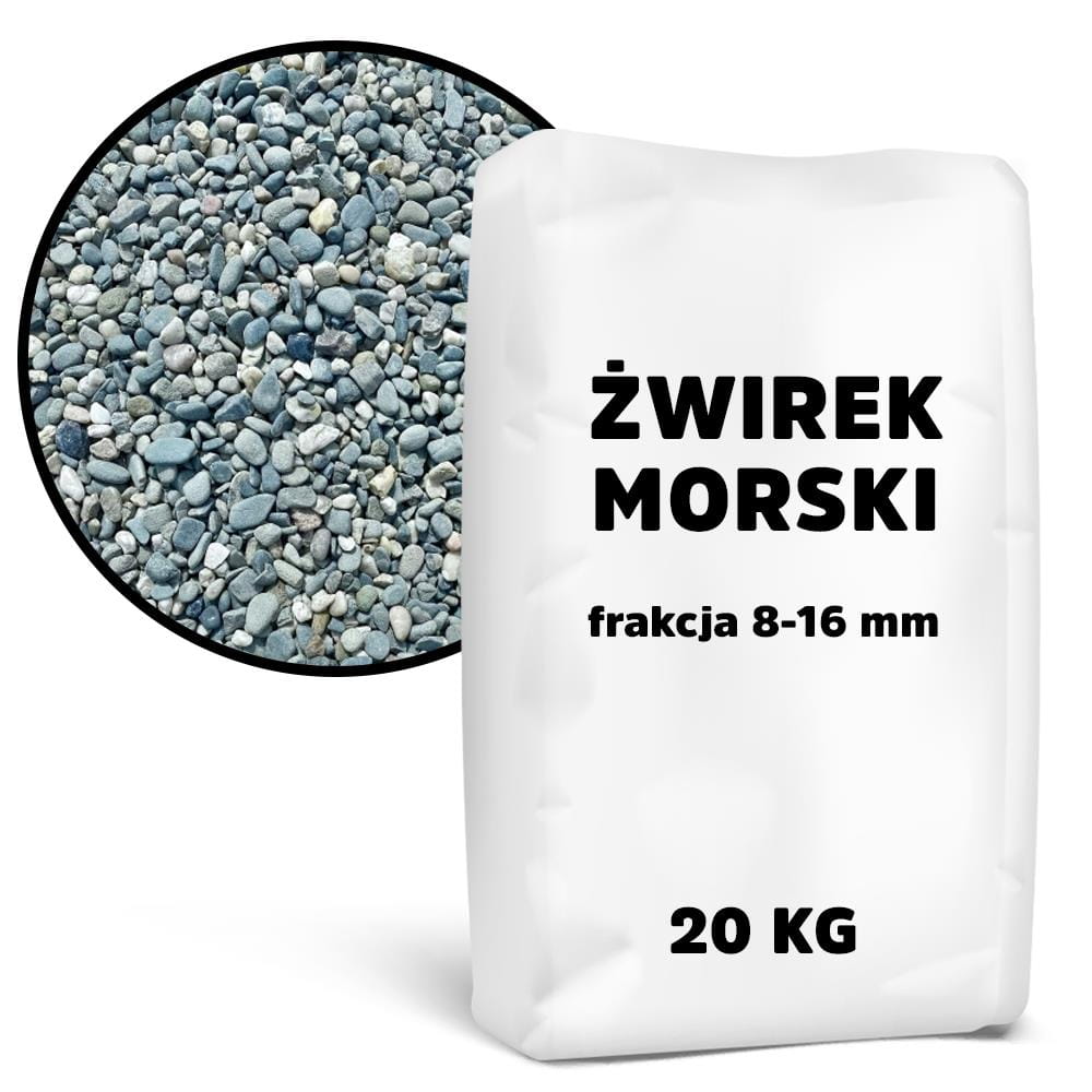 Żwir morski to naturalny materiał wykorzystywany w celach dekoracyjnych czy budownictwie. Worek zawiera 20 kg żwiru morskiego o średnicy ziaren mieszczącej się w przedziale od 8 do 16 mm.